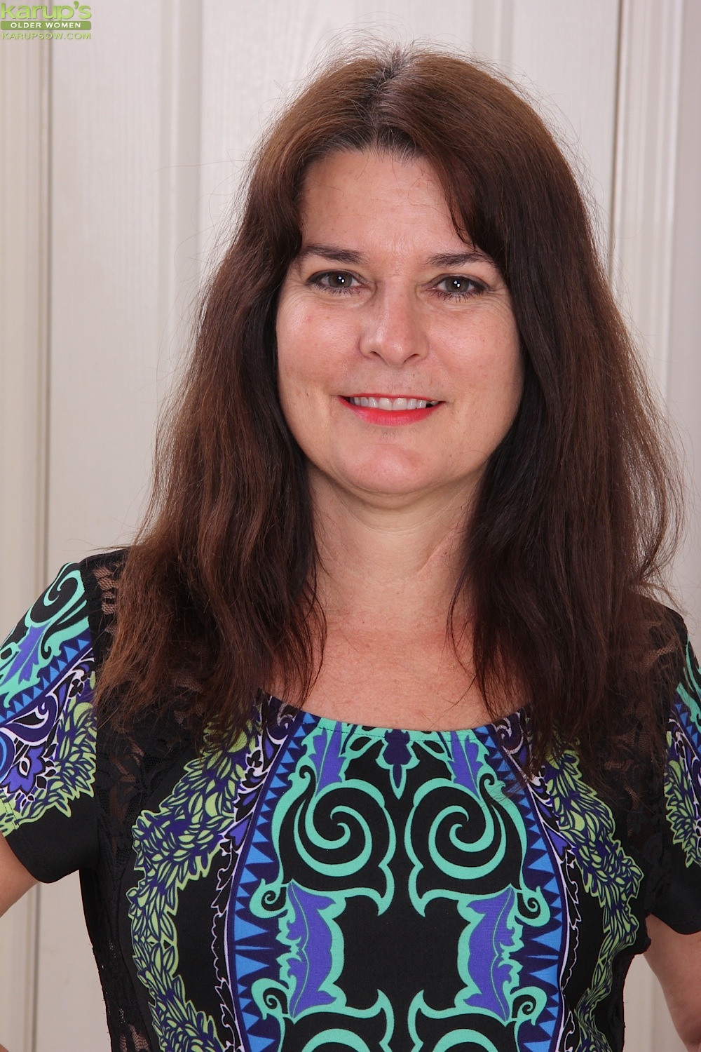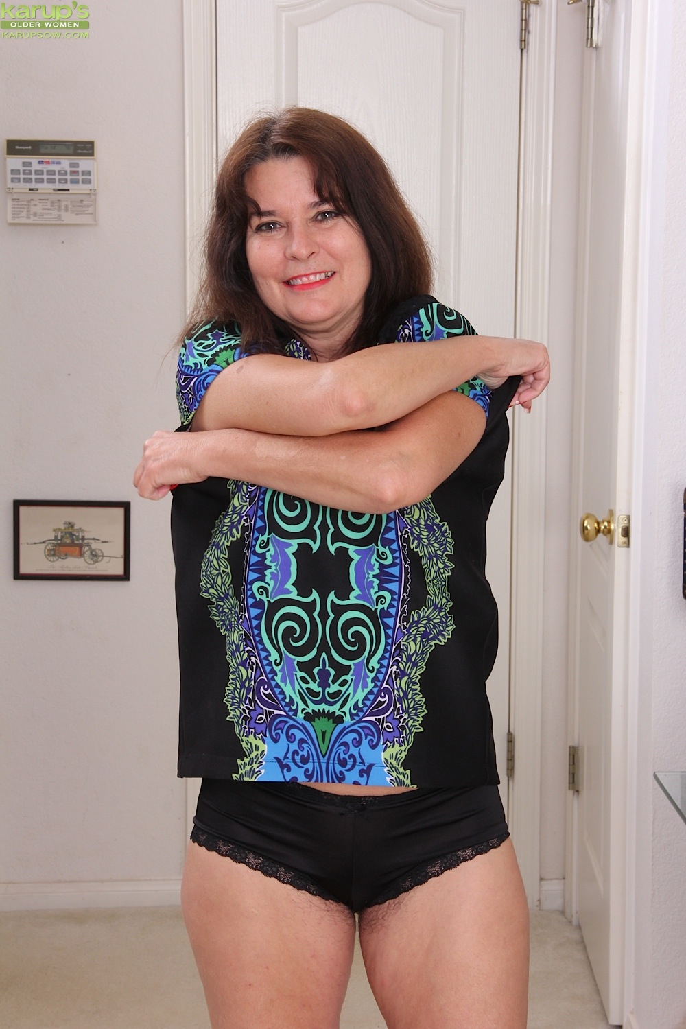 Brunette housewife Bridget Calling spreads her hairy pussy.