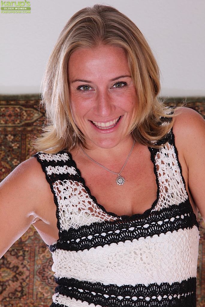 Mature blond babe Sky pulls panties down over tan lined ass.
