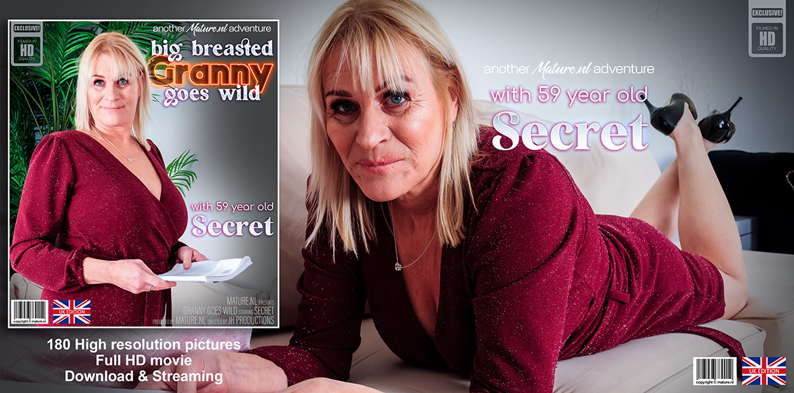 Mature.nl - 59 year old British GILF Secret loves to play with her shaved pussy at home on the sofa