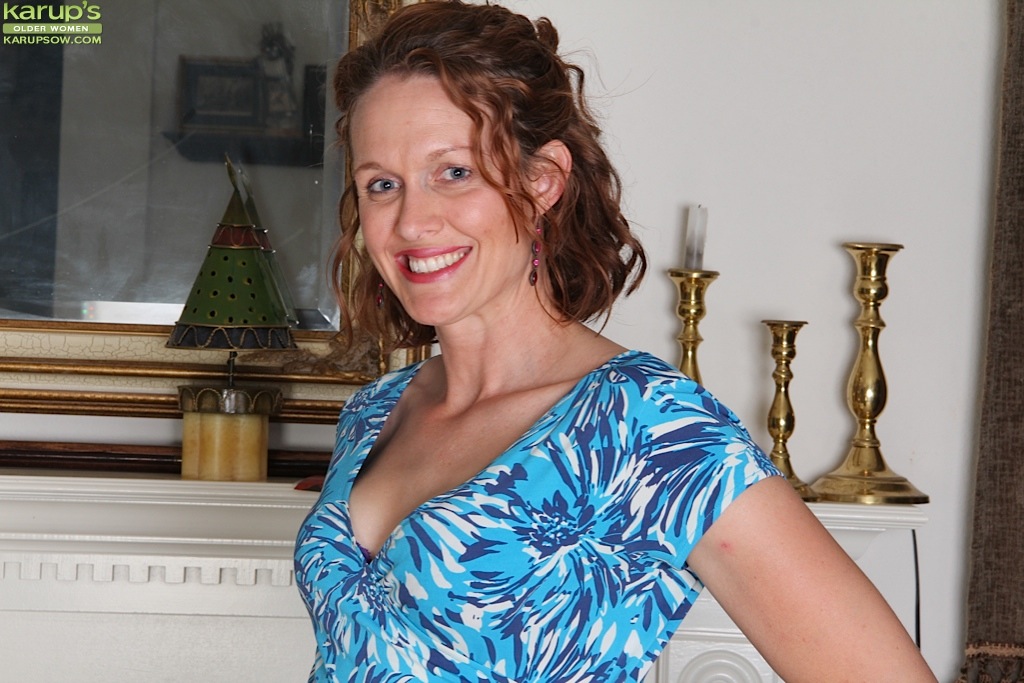 Older redhead Ajia Simpson spreads trimmed pussy.