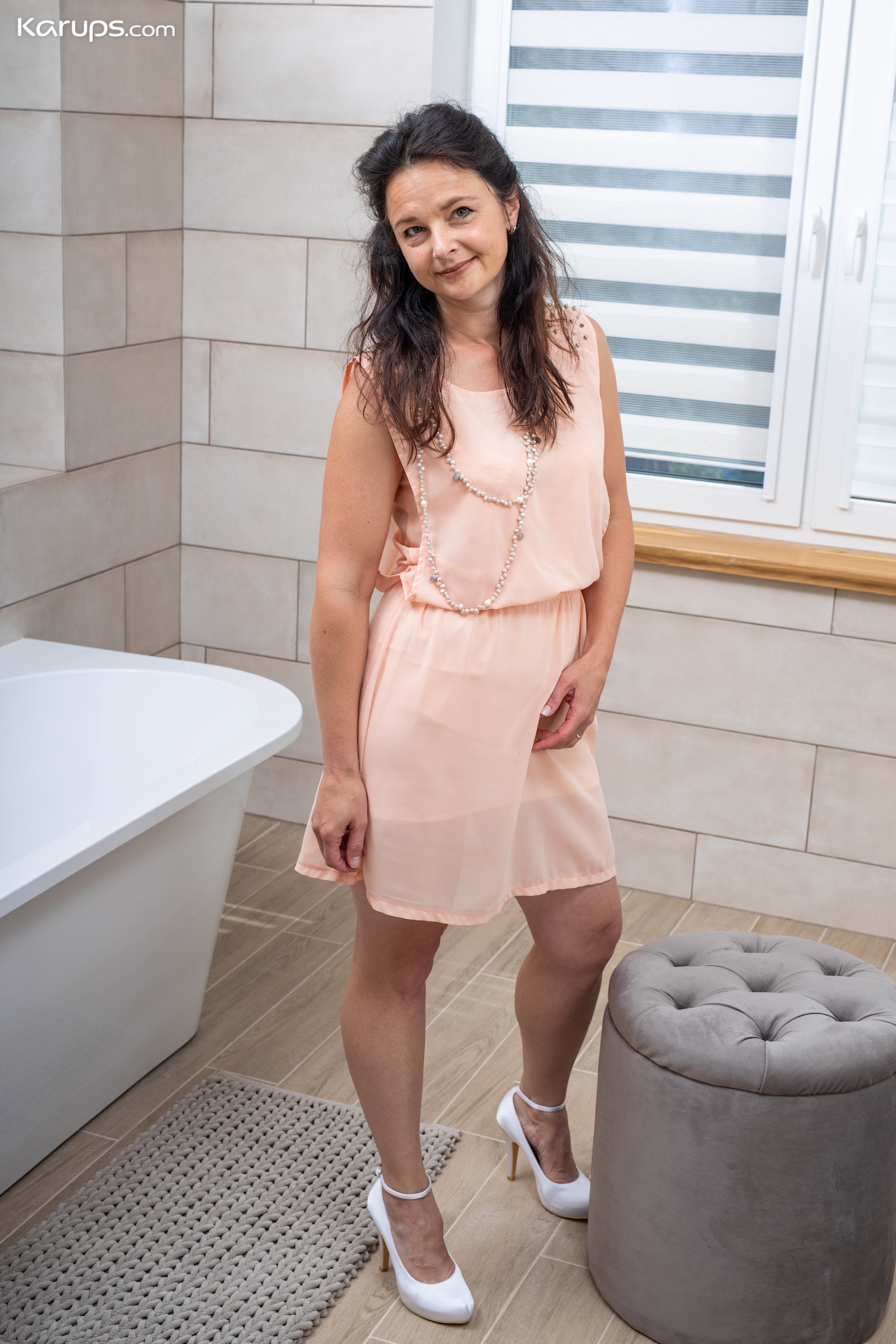 Sexy brunette MILF Anette Harper masturbates in the bathroom.